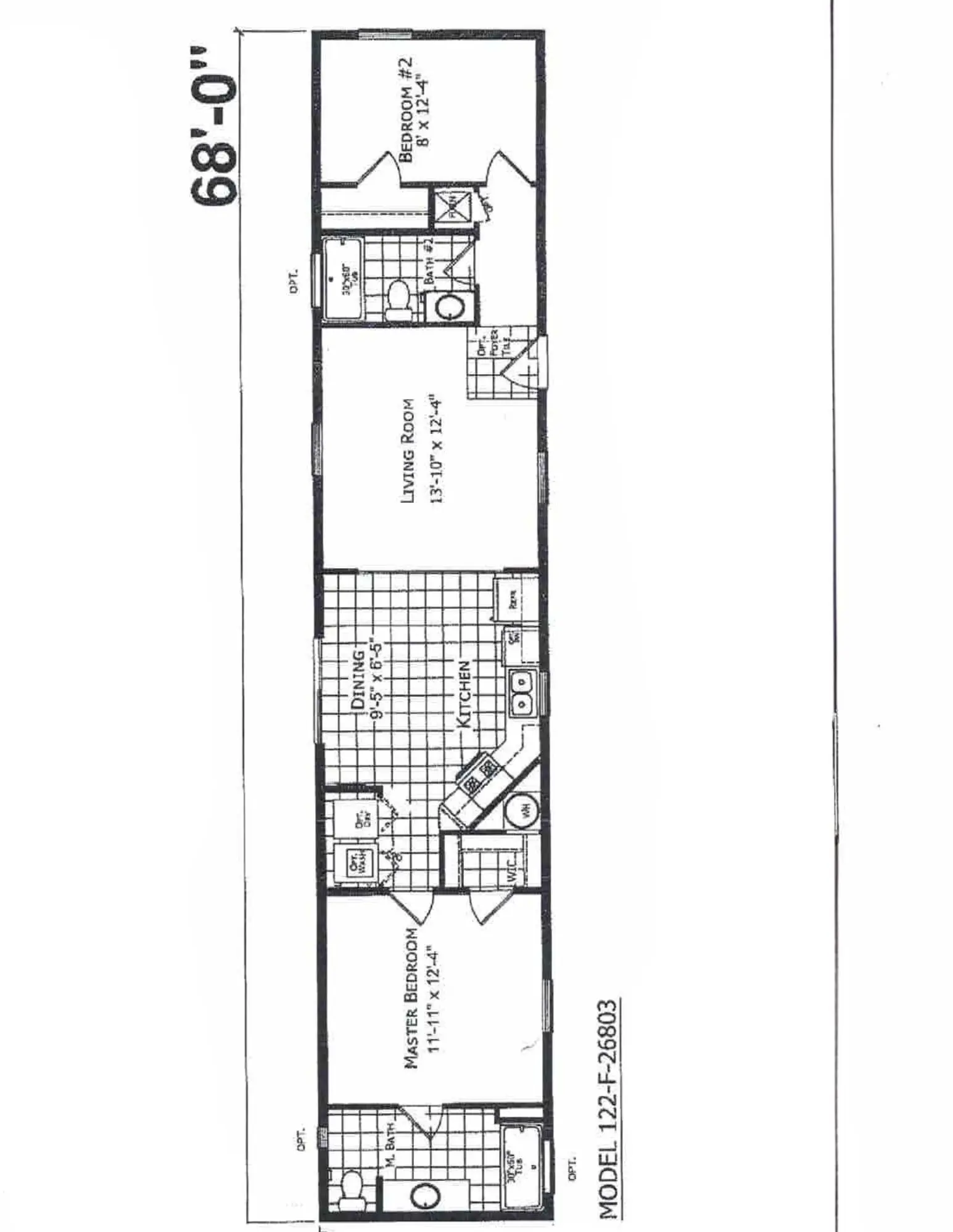 Slab accommodates a 16×68 home, with 1,088 square feet. Floorplan suggestion is open concept, with 2 bedrooms, 2 bath design. Interiors are customizable and can be built to suit.